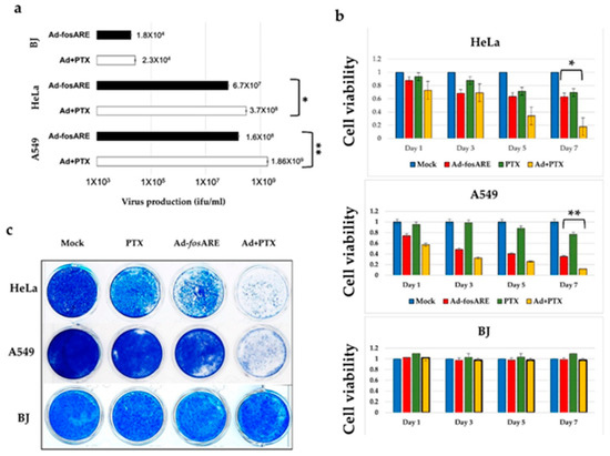 Assessment of combinatorial treatment’s effect (Ad-fosARE and PTX) on viral replication and cell lysis activity. (a) Cancer (HeLa and A549) cells and normal (BJ) cells were infected with Ad-fosARE at an MOI of 10 ifu/cell and 4 nM PTX. Virus production was determined 48 h after through Hexon staining. Each titer (ifu/mL) is shown on the graph. Data are shown above as the mean ± standard deviation of three independent experiments. (b) Cell lysis activities of combination treatment were measured using the XTT assay. As mentioned above, cancer and normal cells were infected with the virus at an MOI of 10 ifu/cell and cell viabilities were estimated 1, 3, 5, and 7 days after infection. (c) Prior mentioned cancer and normal cells were subjected to staining with Coomassie brilliant blue 7 days after infection to observe cytopathic effects. Living cells stained blue. (* indicates p < 0.05, ** indicate p < 0.01).