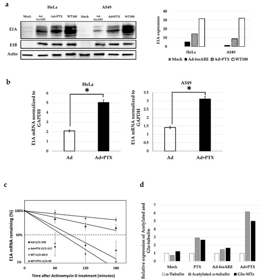 Effects of paclitaxel on Ad-fosARE replication. (a) To check the viral protein synthesis, HeLa and A549 cells were treated in combination with Ad-fosARE (MOI 10) and PTX (4 nM). E1A and E1B55kd were estimated by western blot analysis. Densitometric data of E1A expression (left) (b) With the same dose of treatment E1A mRNA was detected by quantitative real-time RT-PCR using GAPDH mRNA as a normalized control. (c) E1A mRNA stabilization in Ad-fosARE infected cells. HeLa cells were infected with Ad-fosARE and WT300 (MOI-10 ifu/cell) and combination with PTX. Transcriptions were inhibited by actinomycin D 5 µl/mL for 60, 120, and 180 minutes. After the indicated periods, cells were harvested and extracted for total cellular RNA. mRNA levels are quantified by quantitative real-time RT-PCR experiments using GAPDH as a normalization control. Graphs depict the percentage of remaining E1A mRNA levels with GAPDH mRNA and compared with the standards of normalized mRNA species measured immediately after the addition of actinomycin D and which were set as 100%. The half-lives of the mRNAs (min) are indicated as t½. (d) To determine post-translationally modified tubulin, HeLa cells were treated with either Ad-fosARE, PTX or a combination of both. The expression of acetylated and Glu-MTs was quantified by densitometry and the values were normalized to non-infected conditions. Data are shown as the mean ± standard deviation of three independent experiments (* indicates p < 0.05).
