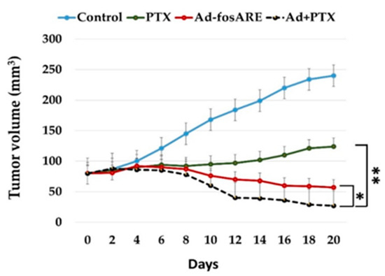 2.9. In Vivo Synergistic Effect of Ad-fosARE and PTX in Murine Flank Tumor