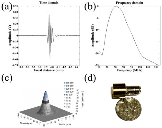 Fabrication of a highly focused 50 MHz transducer. (a) Receive-echo response. (b) Frequency spectrum. (c) 2D acoustic intensity field of spatial peak temporal average (ISPTA) was measured after a 50 MHz transducer was excited with the input parameters of = 25 V, cycle numbers of 10, and pulse repetition frequency of 1 kHz. Acoustic pressure field of the ultrasonic transducers measured by a needle hydrophone. The dB lateral beam width was measured to be 32 m. (d) A photograph of the 50 MHz transducer.