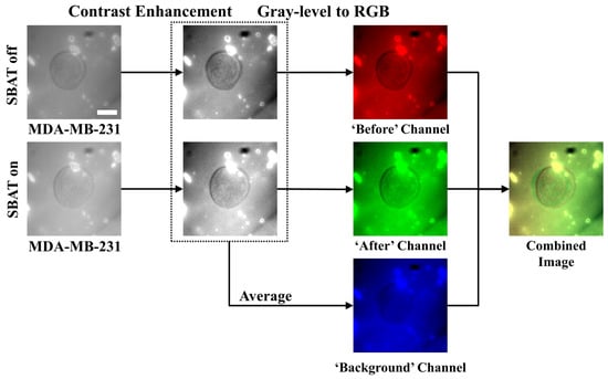 Preprocessing procedures for cell images. The first column presents photomicrographs taken when the SBAT was on and off, displaying the cell membrane deformation with the SBAT. The second column shows the results of the contrast enhancement. In the third column, we composed color channels of the combined image by using the enhanced photomicrographs. First, the red channel corresponds to the predeformation. The green channel exhibits the post deformation. As an average of the red and green channels, the blue channel will show us background areas. The last column is the result of the combination. We applied the same preprocessing method to both more and less deformed cells (MDA-MB-231 and MCF-7). Scale bar indicates 10 m.