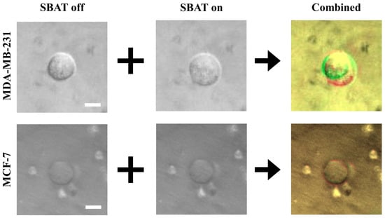 Biophysical characteristics i.e., the elasticity of cells and accurate detection of their morphological changes, can serve as a new diagnostic approach for cancer conditions. We investigated MDA-MB-231 (higher metastatic potential) and MCF-7 (weaker metastatic potential) in a suspended state floating above the Petri dish and monitored the cell lines during the SBAT. Increasing acoustic power facilitates cell deformation, causing area changes that are directly proportional to the applied acoustic pressure. Acoustic pressure was gradually increased from 0.0 to 1.0 MPa with the driving conditions of the fixed duty factor of 1%, the fixed pulse repetition frequency (PRF) of 1 kHz, and various peak-to-peak input voltages (). As shown in Figure 3, the MDA-MB-231 was imaged with the SBAT on and off. Figure 4 presents the comparison between the shapes of the MDA-MB-231 and MCF-7 with the SBAT on and off. Figure 5 is an example of fluorescence live-cell images. A similar tendency was shown for both cells; however, MDA-MB-231 still exhibited more deformation properties under the SBAT, which validates that the Young’s modulus of MDA-MB-231 cells was lower than that of the MCF-7 [9,30,31,32,33,34,35].