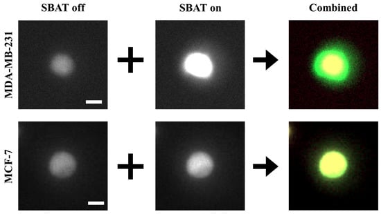 where , , and are pixels on in the ‘background,’ ‘SBAT off,’ and ‘SBAT on’ channels, respectively. Therefore, on our input image (), cells with the SBAT on and off are marked by red and green colors, respectively, as displayed in Figure 3. Figure 4 shows a comparison of preprocessing results of MDA-MB-231 cells with MCF-7 cells. For fluorescent cell images, we can use the same preprocessing methods. Figure 5 presents preprocessing results for the MDA-MB-231 and MCF-7 cells dyed by the fluorescent pigments. The deformation was more visible in the fluorescent cells than in the non-fluorescent ones.