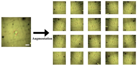 Additionally, we took 40 pairs of images from the 40 cells. However, the number of samples is not enough to train the CNN model. Thus, image augmentation was conducted. We employed the augmentation tool supported by Keras (https://keras.io/preprocessing/image/#imagedatagenerator-class). The augmentation tool generates new images by rotating, scaling, and translating the original images, as displayed in Figure 6. This process also makes the CNN model robust to those transformations. When the proposed model is deployed, the quality of the input photomicrographs is not guaranteed. Operators of this model cannot always be well-trained experts. Therefore, robustness is significant for the practicality of the proposed model.