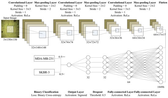 We applied the conventional CNN model to detect invasive cancer cells. We expected that the conventional model would be enough for this task, since deformability, our key feature, is vivid in the preprocessing results (Figure 4 and Figure 5). In this research domain, it is difficult to collect an enormous amount of cell images to train deep CNN models that consist of hundreds of convolutional layers. Although we use the data augmentation, the deep models include too many weights to avoid the overfitting issue. In Section 2 and Section 3, we exhibited that the shallow model has enough accuracy and is free from the overfitting by using the k-fold cross-validation and fluorescence cell images. This model consists of three two-dimensional convolutional layers, three max-pooling layers, and two FC layers. After the convolution parts, we flattened the outputs from matrices to a vector. Then, we put the vector as the input of the FC layers. Lastly, based on the output of the FC layers, we classified cells into two groups: MDA-MB-231 and MCF-7 cells. Figure 7 presents the structure of the CNN model in detail.