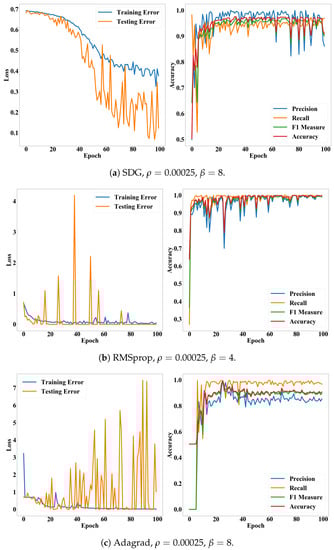 Loss and accuracy of the CNN model according to epochs. (a–c) present accuracy and loss of the SDG, RMSprop, and Adagrad on their optimal hyper-parameters, respectively