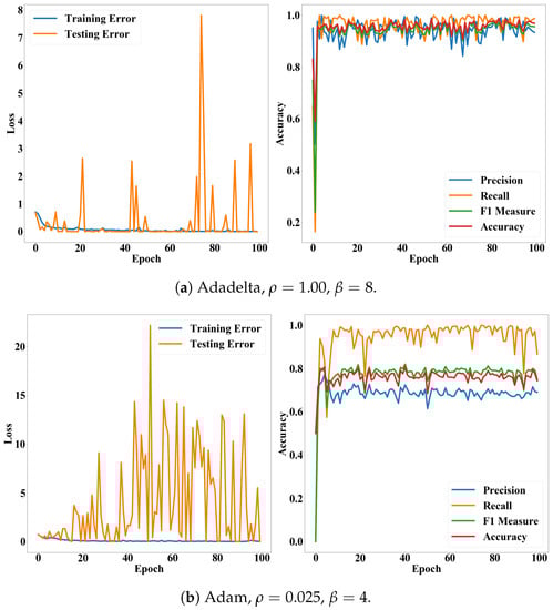 Loss and accuracy of the CNN model according to epochs. Subfigures (a,b) present accuracy and loss of the Adadelta and Adam on their optimal hyper-parameters, respectively.