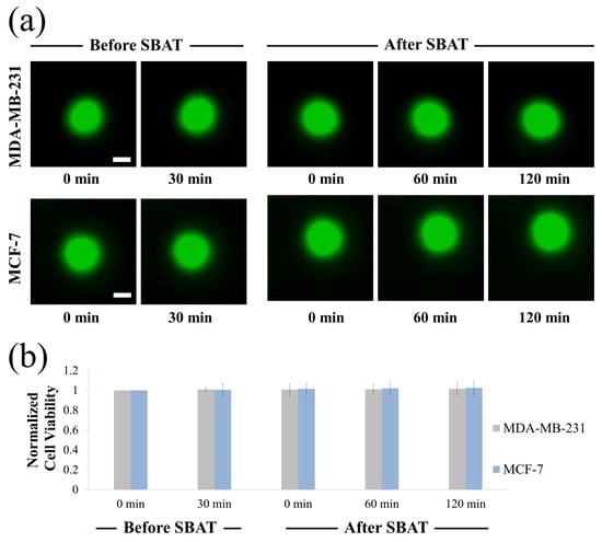 Cytotoxicity of SBATs on MDA-MB-231 and MCF-7 cells was evaluated using Calcein-AM (Thermo Fisher Scientific, Indianapolis, IN, USA). Calcein-AM is a dye that enters live cells converting to green fluorescent. Calcein-AM was prepared as a stock solution of 1 mM in dimethylsulfoxide at room temperature. A final concentration of 10 m of Calcein-AM was added into the cell culture dish. Fluorescence imaging of the cells was observed using a microscope (an excitation of 488 nm and an emission of 532 nm). Figure 10 shows the results of the cell viability experiments: before SBAT (negative control) and after SBAT (experiment). The cells exposed to SBAT with 1.0 MPa for 1 min. If ultrasound affects the cell membrane integrity, the decrease of fluorescence intensity is observed. The normalized mean viabilities (0, 60, 120 min after trapping) for the MDA-MB-231 and MCF-7 cells were 1.012 ± 0.039 and 1.020 ± 0.038, respectively. The values at each cell line are the average of 20 samples. The p-values of all three cell groups were greater than 0.05 ( 0.822 and 0.624 for MDA-MB-231 and MCF-7, respectively). No significant sign of cytotoxicity was found in both the non-trapping and trapping groups.