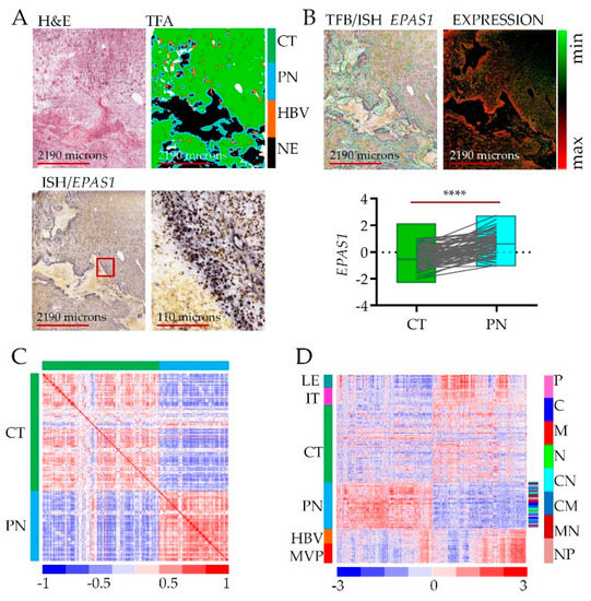 Gene expression analysis in peri-necrotic feature using Ivy Glioblastoma Atlas Project (Ivy GAP database): (A) Reference hematoxylin and eosin staining (H&E) section from tumor W21-1-1-B (top left), converted to tumor feature anatomy (TFA) color map (top right), labeled using in situ hybridization (ISH) probe against Endothelial PAS Domain Protein 1 (EPAS1) gene (bottom); the red square on the left panel indicates the site of magnification on the right. Color code: green—cellular tumor (CT); blue—peri-necrotic zone (PN); orange—hyperplastic blood vessels (HBV); black—necrosis (NE). (B) Reference H&E section from tumor W21-1-1-B merged with tumor feature boundary (TFB) of an anatomic region, labeled using ISH probe against EPAS1 gene (top left); and ISH EPAS1 signal converted to fluorescent signal (top right); normalized log fold change RNA-seq expression data of EPAS1 for CT (n = 111) and PN (n = 66) features, pairwise two-tailed p-value (n = 65) is shown. Sample pairs derived from two anatomic features from the same individual are denoted by the grey lines (**** p-value > 0.00001). (C) A correlation matrix is showing correlation coefficients between gene expression (n = 2707) in CT and PN zones (r = 0.2204). (D) Hieratical clustering of genes identified as significantly deregulated between CT and PZ (n = 2707) in all anatomic features of glioblastoma: leading edge (LE), infiltrating tumor (IT), CT, PN, HBV, and microvascular proliferation (MVP). Glioblastoma subtype classification in the PN zone is shown in color code shown to the right (proneural—P, classical—C, mesenchymal—M, neural—N).