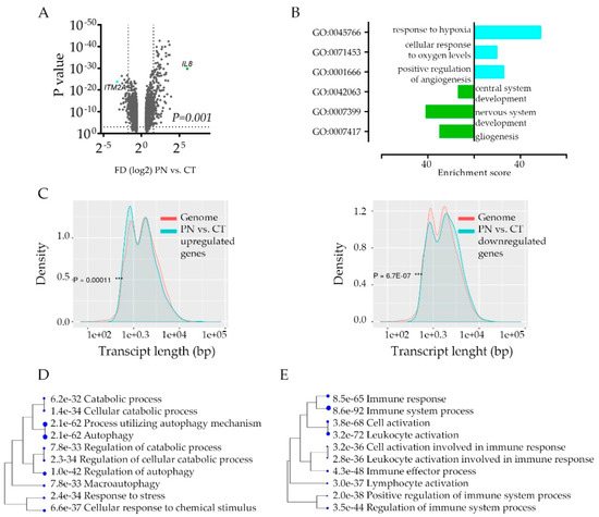 Gene Ontology enrichment analysis in hypoxic feature using Ivy GAP database: (A) CT vs. PN differential gene expression analysis (n = 2707) by volcano plot shows the most (p-value < 0.01. FD2, denoted by dashed lines) up- and down-regulated genes in the PN feature of glioblastoma tumor (n = 366, and 556, respectively). (B) Gene ontology analysis showing top three most enriched biologic functional categories of genes up- (blue) and down-regulated (green) in PN vs. CT glioblastoma anatomic feature. (C) The characteristics of genes down- (n = 366, left) and upregulated (n = 556, right) in PN in comparison with the rest of the transcripts in the human genome based on the transcript length. (D,E) A hierarchical clustering tree summarizing the correlation among significant: unique autophagy pathways genes (D, gene n = 64) and immune system pathway genes (E, n = 451) in PN in comparison to CT feature. Pathways with shared genes are clustered together. Bigger dots indicate more significant p-values.
