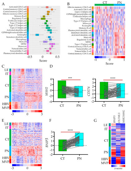 Interestingly, the gene most positively correlated with BNIP3 was MiR-210HG (r = 0.734) – (non-coding RNA MIR210 host gene) hypoxia adaptative response gene [37]. On the contrary, encoding olfactomedin-like protein 3 (OLFML3) is a gene the most inversely associated with BNIP3 expression (r = −0.767) (Figure 3G, Figure S3C). As OLFML3 is endothelial and microglia cell receptor [38], lack of its expression in PN underlined poorly developed vasculature and lack of immune cell infiltration of hypoxic tumor zone with autophagy program turned on, as the recruitment of immune-suppressive microglia into CT zone constitute a formidable barrier for lymphocytes thereby preventing their infiltration into the zone.