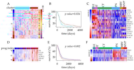 Survival estimator analysis of glioblastoma patients from TCGA based on the cluster membership of genes in the Ivy GAP dataset: (A) Heatmap with color annotations according to profile similarity (blue/red) of 50 most down-regulated genes (based on differential analysis of CT and PN zones, n = 2707) annotated with Hazard Ratios (HR red-violet) from Cox analysis. (B) Survival analysis of TCGA GBM samples dataset stratified according to their cluster membership (blue/red) from panel (A) using Kaplan–Meier analysis. (C) Heat map of RNA-seq expression correlation data for 15 (with p-value < 0.01) from 50 gene signature in all glioblastoma anatomic features is shown. (D) Hierarchal clustering analysis of a full cohort of TCGA GBM samples dataset stratified by inspecting the status of genes (n = 6) with the most prognostic index (based on autophagy (n = 64) and immune mode (n = 451) genes’ inputs). (E) Survival analysis based on the impact of the 6-gene from panel (D) with prognostic index hazard ratio = 1.61 and log-rank p-value = 0.002 in a full cohort in TCGA GBM samples dataset using Kaplan–Meier analysis. (F) Heat map of RNA-seq expression correlation data for six genes from panel (D) signatures in all glioblastoma anatomic features is shown.