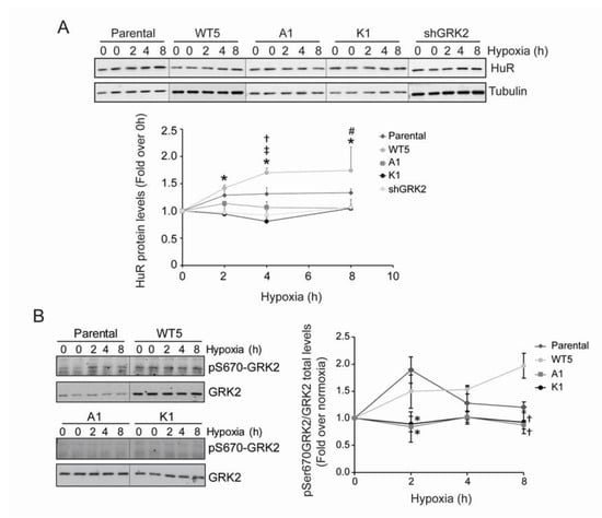 pS670-GRK2 modulates hypoxia-induced HuR upregulation. (A,B) HeLa stable cell lines were cultured under hypoxia and the pSer670 GRK2, GRK2, and HuR levels were analyzed by immunoblotting, at the indicated times. Values are mean ± SEM from 4–6 independent experiments. Upper panel: ‡ p < 0.05 wt5 vs. parental; # p < 0.05 A1 vs. parental; * p < 0.05 K1 vs. parental; † p < 0.05 shGRK2 vs. parental (Student’s t-test). Lower panel: * p < 0.05 A1 and K1 vs. parental; † p < 0.05 A1 and K1 vs. WT5 (Student’s t-test). Detailed information about the Western blots can be found in Figure S4.