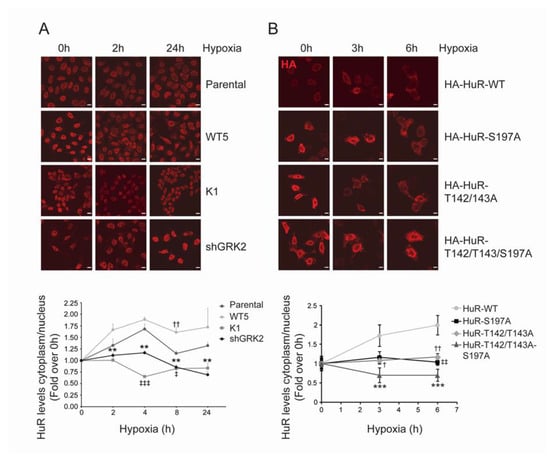 HuR is mainly localized in the cell nucleus in basal conditions, whereas its activity in stress conditions is tightly linked to protein cytosolic shuttling [32,36]. Akin to stress conditions such as UV treatment [37], serum starvation [38], or heat shock [39], cytosolic translocation of the HuR protein occurs after prolonged CoCl2 exposure, a condition mimicking hypoxic stress [35]. We observed that GRK2-mediated HuR phosphorylation markedly affects the HuR cytoplasmic accumulation in hypoxia. In parental Hela cells, HuR protein is mobilized from the nucleus as early as 2 h after low oxygen exposure, in line with previous reports [40], and enhanced cytoplasmic HuR levels are still noted 24 h afterwards (Figure 3A). Such a pattern of HuR mobilization was potentiated by over-expression of wild-type GRK2, whereas no shuttling was observed in the cells expressing a catalytically inactive GRK2 mutant (Hela-K1) or upon GRK2 downmodulation (Hela-shGRK2). Consistent with a relevant role for GRK2-mediated HuR phosphorylation in this process, the cytosolic redistribution of phospho-defective HuR mutants HuR-S197A or HuR-T142/143A was markedly reduced upon exposure to hypoxia for 3 h or 6 h (Figure 3B). The combination of these mutations in the triple HuR-T142/143/197A construct resulted in a stronger impairment of HuR shuttling (Figure 3B). None of these HuR mutations appear to disturb the localization of HuR in untreated cells, suggesting that GRK2 regulation specifically takes place under stress.