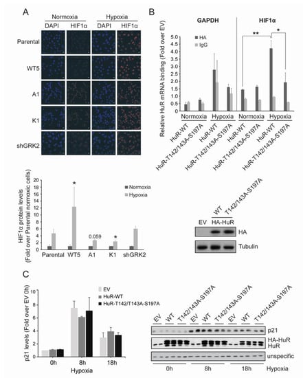 It has been proposed that stress-induced HuR might not bind with identical affinities to its mRNA targets [40], suggesting an HuR target “prioritization” in response to specific stress stimuli. Interestingly, the hypoxia-induced protein levels of p21, a well-known HuR target [34] was not altered by the HuR-T142/T143A-S197A expression (Figure 4C), thereby suggesting that phosphorylation of HuR by GRK2 alone or together with other hypoxia-induced kinases, does not necessarily affect other HuR targets.