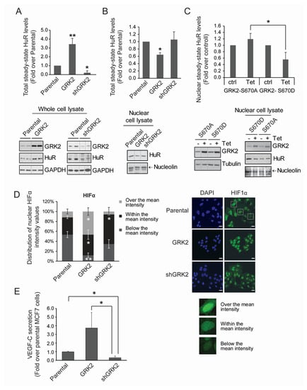 GRK2 modulates HuR levels and cytoplasmic shuttling, HIF1-α distribution, and VEGF-C secretion in luminal breast cancer cells. (A,B) Whole lysates or nuclear extracts from MCF7 cells stably expressing GRK2-wt or shGRK2 were used to analyze the HuR levels by immunoblot. Values are mean ± SEM from 3–4 independent experiments. * p < 0.05 ** p < 0.01 (Student’s t-test). Representative blots with loading controls are shown. (C) MCF7 stable inducible cell lines were treated with tetracyclin (Tet) to induce the expression of the indicated GRK2 mutants. HuR nuclear levels were analyzed by immunoblot. Values are mean ± SEM from two independent experiments. * p < 0.05 (Student’s t-test). Representative blots with loading controls are shown. (D,E) HIF1-α distribution and VEGF-C secretion levels were analyzed in parental MCF7 cells or in derived cells lines stably overexpressing GRK2 or a silencing construct (shGRK2) of the kinase. (D) HIF1-α and DAPI staining was analyzed by immunofluorescence; distribution of intensity values is shown. Values are distribution percentages of cells with HIF1-α intensity values over, within, or below the mean intensity. Representative images are shown. * p < 0.05; ** p < 0.01 (Student’s t-test) when each category (over, within, below) in MCF7-GRK2 and MCF7-shGRK2 cells is compared to parental ones. Scale Bar = 25 µm. (E) ELISA-measured VEGF-C secretion values are shown (mean ± SEM from 3 independent experiments). * p < 0.05 (Student’s t-test). Detailed information about the Western blots can be found in Figure S7.