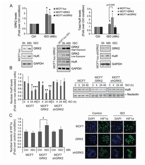 Therefore, we addressed whether chronic β2-adrenergic receptor stimulation promoted HuR regulation by GRK2 in MCF7 breast cancer cells. Isoproterenol challenge upregulated total HuR protein levels in both parental and MCF7-GRK2 cells, but not in GRK2-silenced cells (Figure 6A). Isoproterenol also triggered parallel changes in GRK2 protein, suggesting that adrenergic effects on HuR levels involve GRK2. In addition, isoproterenol stimulation also promoted a reduction of HuR nuclear protein levels in parental cells, and this effect was potentiated in the presence of extra kinase in MCF7-GRK2 cells (Figure 6B). However, isoproterenol treatment failed to promote the nuclear exit of HuR in MCF7-shGRK2 cells, indicating that GRK2 activity is required for HuR mobilization. Consistent with the increased mobilization of nuclear HuR, nuclear HIF1-α protein was upregulated after 48 h of βAR stimulation in cells overexpressing GRK2, compared to parental cells (Figure 6C).