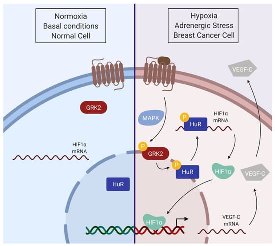 In this paper, we identified GRK2 as a modulator of the HuR/HIF-1α axis in relevant pathological settings. We uncovered that HuR is a GRK2 substrate, requiring prior phosphorylation of GRK2 at its Ser670 regulatory site. Phosphorylation by GRK2 enhances the HuR levels and the cytosolic shuttling of HuR upon hypoxic conditions, favoring its binding to HIF-1α mRNA and increased nuclear accumulation of this central modulator of hypoxia-driven pathways. In the MCF7 cells, a cellular model of luminal A breast cancer in which upregulation of GRK2 and HuR frequently concur, GRK2 increased the total and basal cytosolic HuR protein levels, which correlated with a higher nuclear distribution of HIF-1α and enhanced secretion of the lymphoangiogenic factor VEGF-C in normoxic conditions. Moreover, chronic adrenergic stimulation fosters the HuR/HIF1-α module in MCF7 cells through GRK2 (Figure 7), which could facilitate survival of malignant cells even before the expanding tumor mass become hypoxic, and could also improve the adaptation of tumor cells to the hypoxic environment of lymphatic vessels and to other tumor-related stresses.