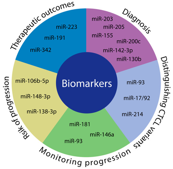 miRs as diagnostic, prognostic and predictive biomarkers. miRs possess an important clinical potential to be used as biomarkers. In CTCL, evidence suggests that they may be able to discern CTCL from benign inflammatory dermatoses (diagnosis) as well as distinguish between subtypes of CTCL (distinguishing CTCL variants). Furthermore, miRs may be able to stratify patients into low vs. high risk of progression groups (risk of progression) and could be used to monitor progression in patients (monitoring progression). Additionally, expression of certain miRs may be able to predict treatment outcomes (therapeutic outcomes).