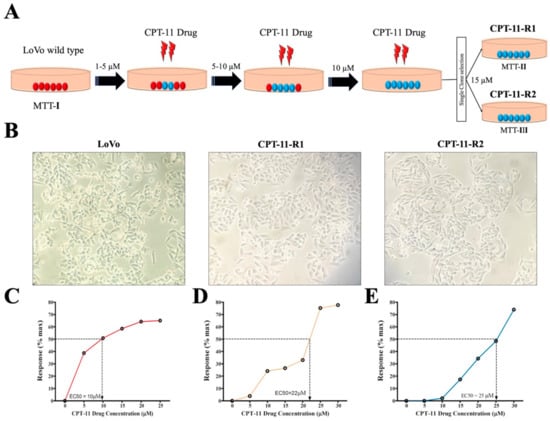 Drug-resistant cell lines were generated by plating 106 cells in 10 cm plates, and thereafter treated with 1 µM CPT-11 drug for 12 days. The medium was replaced every 72 h with fresh medium containing the drug. Following the same procedure, the cells were challenged with 1 µM to 10 µM CPT-11 drug to continue enhancing the drug resistance for six months (Figure 1A). Then, we compared the morphological changes of the LoVo cells and the CPT-11-R clones (Figure 1B). The level of drug resistance was determined using 3-2,5-diphenyltetrazolium bromide (MTT) assay. First, we determined the LoVo cell EC50 values after CPT-11 drug treatment at different concentrations (Figure 1C). After the generation of a single clone with resistance to 10 µM CPT-11, an isolation method was used to isolate the different clones, and then, we performed another MTT assay to determine the resistant cell drug response (% maximum). Finally, a single clone was selected and maintained with 15 µM CPT-11 for one month, and the resistant cell drug response was determined once again using MTT (Figure 1D,E).