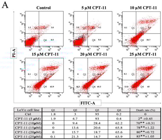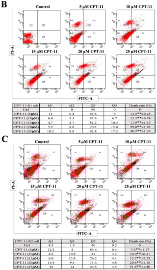For the flow cytometry Annexin V apoptosis assay, the LoVo cells and CPT-11-R clones were treated with different concentrations (5, 10, 15, 20, and 25 µM) of the CPT-11 drug for 48 h (LoVo cells) and 72 h (CPT-11-R clones). The cells were collected and stained using an Annexin V-FITC apoptosis detection kit (BD, Biosciences, San Jose, CA, USA) according to the manufacturer’s protocol. Flow cytometry was performed at the Fluorescence Activated Cell Sorting (FACS) Core Facility, China Medical University, Taiwan, using a FACS CantoTM system (BD, Biosciences). Cells were gated to obtain cell singlets after cells in each quadrant of the fluorescein isothiocyanate (FITC-A) versus PI plot. For convenience, only 10,000 cells of the 50,000 cells visualized were counted. The cell death rate was calculated as 100%(1–(Q3Drug/Q3Control)).