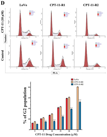 For the cell cycle analysis, LoVo cells and CPT-11-R clones were treated with different concentrations (5, 10, 15, 20, and 25 µM) of the CPT-11 drug for 48 h (LoVo cells) and 72 h (CPT-11-R clones). After treatment, the cells were harvested and then washed with cold PBS. The cells were further fixed with 70% ice-cold ethanol at 4 °C overnight. After incubation in PBS containing 10 mg/mL PI and 0.5 mg/mL RNase A for 15 min at room temperature (RT), the fixed cells were washed with ice-cold PBS thrice. FACS CantoTM flow cytometry was used to determine the DNA content of the labeled cells. For all cycle events, n = 10,000 cells.