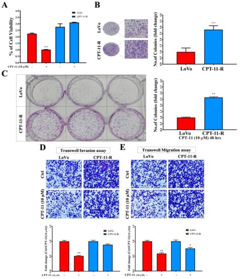 CPT-11-R cells demonstrate enhanced first-line chemoresistance, colony formation, and invasion and migration ability. (A) The chemoresistance ability of CPT-11-R cells was determined after 10 µM CPT-11 drug treatment for 48 h in comparison with LoVo cells. (B) The colony formation ability of the CPT-11-R cells was determined without treatment under normal conditions and fold change normalized with untreated control group. (C) CPT-11-R cell colony formation ability with 10 µM CPT-11 treatment. (D) Invasion and (E) migration assay (scale bar: 100 µm). The results are presented as mean ± standard error of the mean (n = 3). * p < 0.05, ** p < 0.01, *** p < 0.001 compared to control.