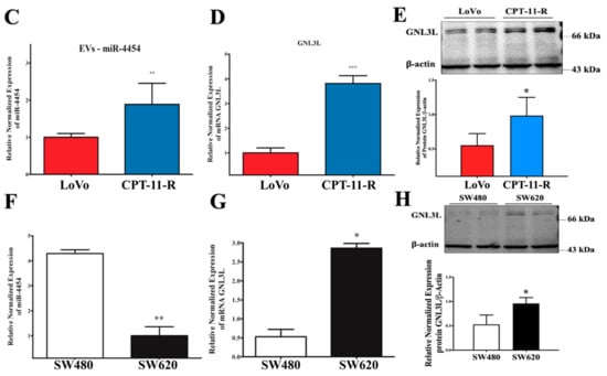 Chemotherapy response is closely correlated to the functional status of the microRNA expression level or that of the microRNA-regulated gene. Notably, we found that miR-4454 was downregulated in chemoresistant CRC and that one of the target genes, GNL3L, had a higher expression level in the CPT-11-R cell line compared to that in the LoVo colon cancer parental cell line. Downregulation of miR-4454 mediates chemoresistance and cell survival, demonstrating that the miR-4454 target gene, GNL3L, may play an important role in CRC chemoresistance and survival. The miR-4454 was previously reported in the LIM1863 colon carcinoma cell line to be secreted through EVs and exosomes [20].