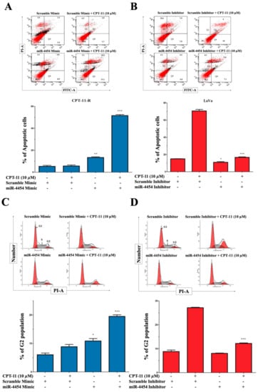 We examined whether the ectopically overexpressed miR-4454 promotes the sensitivity of the CPT-11-R cells to the CPT-11 drug, and we found that miR-4454 inhibited cell invasion and migration and colony formation ability and increased the cell death rate in the presence of anticancer drugs. Overexpressed miR-4454 in the CPT-11-R cells enhanced chemosensitization, and when miR-4454-overexpressing cells were challenged with the CPT-11 drug (with EC10 concentration from the MTT assay of resistant cells), the apoptotic cell rate was increased compared to that in the controls. This finding indicated an increased chemosensitivity to CPT-11 drug treatment in the ectopic miR-4454-transfected CPT-11-R cells at 48 h (Figure 6A). Consistent with this observation, the inhibition of endogenous miR-4454 enhanced the chemoresistance of LoVo cells against the CPT-11 drug. Suppressed endogenous miR-4454 levels promote the chemoresistance of LoVo cells, showing that LoVo cells treated with the CPT-11 drug had an increased rate of apoptosis compared to that of the controls, and the inhibition of endogenous miR-4454 led to a lower rate of apoptosis compared to that of the controls. Cells with inhibited endogenous miR-4454 that were challenged with the CPT-11 drug (EC50 concentration was based on that of the LoVo cell MTT assays) showed a decreased rate of apoptosis compared to that of the controls. This finding implies an increased chemoresistance state for the LoVo cells transfected with the endogenous miR-4454 inhibitor and challenged with CPT-11 drug treatment for 48 h (Figure 6B).