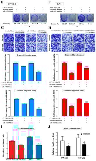 MiR-4454 suppresses colon cancer cell growth, invasion, and migration through the GNL3L and NF-κB pathways. (A) Annexin V apoptosis cell flow cytometry analysis for ectopic overexpression of miR-4454, which enhances the chemo sensitization effect of CPT-11-R cells treated with CPT-11 (10 µM) at 48 h time point (upper & lower). (B) Inhibition of endogenous miR-4454 promotes LoVo cell chemoresistance to CPT-11 (10 µM) at 48 h time point (upper & lower) and fold change normalized with scramble mimic for CPT-11-R and scramble inhibitor for LoVo cell line. (C) Cell cycle G2/M phase analysis during ectopic overexpression of miR-4454 in the CPT-11-R cells (upper & lower) and (D) during endogenous miR-4454 inhibition in LoVo cells (upper & lower). (E,F) Colony formation ability of CPT-11-R cells and LoVo cells. (G) Results from the invasion/migration analysis of ectopically overexpressed miR-4454 in CPT-11-R cells (upper & lower). (H) Results from the invasion/migration analysis of the inhibited endogenous miR-4454 in LoVo cells (upper & lower) (scale bar: 100 µm). (I,J) Results from the promoter assay analysis of the relative luciferase NF-κB promoter signal unit reduction in miR-4454-overexpressed groups. The results are presented as mean ± standard error of the mean (n = 3). * p < 0.05, ** p < 0.01, *** p < 0.001 compared to control.