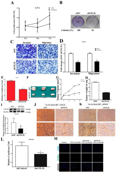 - Tang, X.; Zha, L.; Li, H.; Liao, G.; Huang, Z.; Peng, X.; Wang, Z. Upregulation of GNL3 expression promotes colon cancer cell proliferation, migration, invasion and epithelial-mesenchymal transition via the Wnt/beta-catenin signaling pathway. Oncol. Rep. 2017, 38, 2023–2032. [Google Scholar] [CrossRef]
