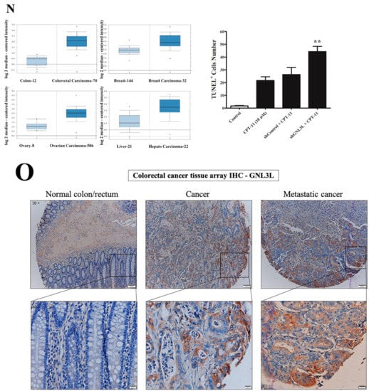 We further examined the functional effect of GNL3L in colon cancer cells in vivo by subcutaneously injecting LoVo cells pretreated with a predesigned GNL3L silencer that is activated in vivo, and the systemic delivery of predesigned siRNA was performed thrice with one-week intervals. The results showed that the silenced GNL3L reduced the tumor volume significantly in the LoVo cell group compared with that of the control group (Figure 7F–H), and we further confirmed GNL3L expression using Western blotting and immunohistochemistry (Figure 7I,J) and NF-κB expression using IHC (Figure 7K). Furthermore, we confirmed the GNL3L silencing in the microsatellite stable metastatic SW620 colon cancer cell line using shRNA. The results from the shRNA silencing in NF-κB promoter assays showed a significant reduction in luciferase unit compared to that of the controls (Figure 7L). The Terminal deoxynucleotidyl transferase dUTP nick end labeling (TUNEL) assay results showed a significant increment of TUNEL-positive cells in shGNL3L treated with CPT-11 (10 µM) at 24 h (Figure 7M). Based on the Oncomine database (https://www.oncomine.org/), a higher GNL3L expression was found in tumors belonging to four different cancer data sets (colorectal, liver, breast, ovarian) (Figure 7N), in comparison to that of normal tumors. Given that there is an inverse relationship between the normal and cancer tissue expression of GNL3L, it is interesting to evaluate their expression patterns in clinical samples. We performed IHC experiments to evaluate GNL3L expression using a commercial human CRC (with respective metastatic tumor and adjacent normal cells) tissue array (CO992a). The results demonstrated that the low expression of GNL3L in adjacent normal patient tissue was significantly and inversely correlated with the high expression of GNL3L in cancer and metastatic cancer patient tissues (Figure 7O and Table 1). These findings confirmed that GNL3L has a tumorigenic effect on colon cancer cells.