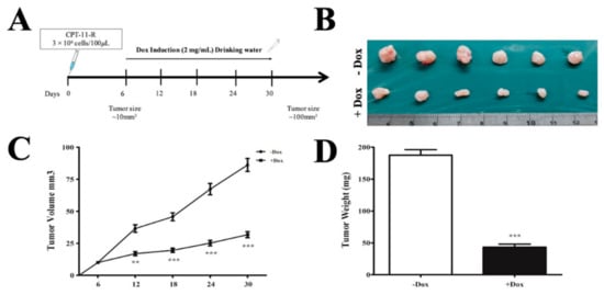 Five-week-old BALB/C-NU/NU male mice purchased from BioLASCO, Taiwan, were used for the subcutaneous injection model. The experimental protocol (CMUIACUC-2019-237) was approved by the Institutional Animal Care and Committee of China Medical University. The LoVo cells (3 × 106) were injected into nude mice (N = 3 per group). For gene silencing, the GNL3L group was administered with siGNL3L (50 µM in 25 g mice) according to the manufacturer’s protocol (Ambion®, Life Technologies, Carlsbad, CA, USA). The Dox-inducible CPT-11-R cells expressing miR-4454 (3 × 106) were injected subcutaneously into the nude mice. After 6 days, the nude mice were separated into two groups (N = 6 per group). To induce miR-4454 expression, 2 mg/mL doxycycline was added to the drinking water, and the water was changed every 2 days for a 3-week period [33,34]. The other group of mice was not induced with Dox. The tumor size was measured using a caliper in 6-day intervals. The animals were housed and experimentally handled in a pathogen-free environment, and 12/12 day-night cycle was maintained according to the committee. The tumor volume was calculated using the formula volume = length × width 2/2. All animals were sacrificed 30 days after the cell injection. The tumors were further analyzed by Western blotting and by miR-4454 and GNL3L gene expression.