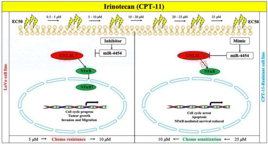 This study aimed to identify how cells acquire resistance to anticancer drugs and whether the downregulation of miR-4454 is associated with the progression of CRC. Here, we generated an irinotecan (CPT-11) drug-resistant clone (CPT-11-R) from the LoVo cell line by stepwise increments of CPT-11 drug exposure during culturing. Then, we found the microRNAs that were differentially expressed in CPT-11-R-resistant clones with respect to LoVo cells and identified the upregulated and downregulated microRNAs. Furthermore, we have identified miR-4454 dysregulation and secretion through extracellular vehicles (EVs) in resistant cells. We found that most resistant cells significantly downregulated miR-4454 to regulate the GNL3L gene and thus induce the drug-resistant state. We discovered that miR-4454 directly targets GNL3L and reduces tumorigenicity. In addition, we found that, as a consequence of miR-4454 overexpression, the CPT-11-R clones had increased rates of apoptosis and G2/M arrest when treated with the first-line CPT-11 drug, and we also observed that the inhibition of miR-4454 in LoVo cells was inversely correlated with miR-4454-overexpressing CPT-11-R cells. Our study indicates that the development of miR-4454 as a microRNA-based therapeutic approach for silencing GNL3L may remarkably reduce oncogenic cell survival that depends on GNL3L/NF-κB signaling, making miR-4454 a candidate modality for treating metastatic human CRC.