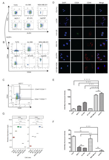 To understand the relation of CD44, CD24 and ALDH1 expression with tumorigenic cells in breast cancer, we chose six cell lines to represent the major molecular subtypes of breast cancer: MCF-7 and T47D (luminal A), BT-474 (luminal B, HER2-OE), AU-565 (HER2-OE), Hs578T and MDA-MB-231 (triple-negative/basal like). Recent research has suggested that a high CD44/CD24 ratio and high ALDH expression correlate positively with proliferation and tumorigenesis [14,24,25,26]. Using flow cytometry, we investigated the expression of CD44, CD24 and ALDH activity in these cell lines. We analyzed ALDH activity by treating the cell lines with ALDEFLUOR and calculating the percentage of ALDEFLUOR-stained cells (ALDHbr). ALDHbr cells were the highest in HER2-OE cell lines BT-474 (20%) and AU-565 (26%); the prevalence was <1% in all other lines (Figure 1A). However, we did not find ALDHbr cells in MDA-MB-231. Consistent with previous research [21,27], our results revealed that triple-negative cell lines had a primarily CD44high/CD24−/low/ALDH− profile (CD44high/CD24−/low), whereas luminal A cell lines MCF-7 and T47D had a CD44−/low/CD24−/low/ALDH− profile (CD44−/low/CD24−/low). Luminal B and HER2-OE cell lines BT-474 and AU-565 had a mixed profile of CD44−/low/CD24−/low and CD44−/low/CD24−/low/ALDHbr (ALDHbr) cells, with CD44−/low/CD24−/low constituting the majority of cells (Figure 1B, Supplementary Figure S1A). Fluorescence and real-time quantitative reverse transcription PCR (qRT-PCR) analysis of CD44 and CD24 in the cell lines showed a similar expression profile (Figure 1D–G), with triple-negative cell lines significantly overexpressing CD44. Interestingly, MCF-7 showed a lower expression of CD44 compared to AU-565 (Figure 1E, G) which is considered to have comparatively lower malignancy [28]. Taken together, these results show that luminal A breast cancer cell lines (T47D and MCF-7) were predominantly CD44−/low/CD24−/low and ALDH−. Cell lines overexpressing HER2 (BT-474 and AU-565) had a higher proportion of ALDHbr cells and triple-negative cell lines (Hs578T and MDA-MB-231) were almost exclusively CD44high/CD24−/low.