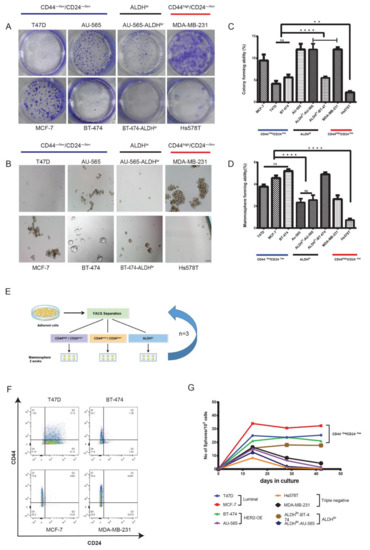 In this study, we performed a systematic comparison of six breast cancer cell lines representing different molecular subtypes, including luminal A (T47D and MCF-7), luminal B (BT-474), HER2-OE (AU-565) and triple-negative/basal-like subtype (MDA-MB-231 and Hs578T) for CD44, CD24 expression and ALDH activity. We first categorized the cells into different subpopulations according to biomarker expression and then carried out a systematic and comparative analysis of these subpopulations for hallmark stem cell characteristics of differentiation, migration, invasiveness, and metastatic potential using established in vitro and in vivo techniques. We also analyzed the expression of genes that are considered to be hallmarks of metastasis, pluripotency and proliferation. Finally, we assessed the expression of ALDH1 isotypes ALDH1A1 and ALDH1A3 in these phenotypes to ascertain the role of ALDH1 in BCSC function.