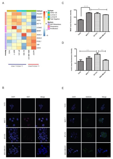 Our mRNA expression results showed that the CD44−/low/CD24−/low subpopulation from luminal cell lines and CD44high/CD24−/low subpopulation from highly tumorigenic cell line MDA-MB-231 had similar expression of pluripotency markers and proliferation marker MKI67. We further compared the protein expression of NANOG and MKI67 in mammospheres generated by CD44−/low/CD24−/low cells from luminal cell lines with that of mammospheres from CD44high/CD24−/low cells of MDA-MB-231. Mammospheres of CD44−/low/CD24−/low origin from all luminal cell lines expressed NANOG equivalent to or higher than mammospheres of CD44high/CD24−/low origin. BT-474 mammospheres showed significantly higher expression than MDA-MB-231 (p < 0.01) (Figure 3D,E). Except for T47D, MKI67 expression in luminal mammospheres was similar to mammospheres from MAD-MB-231 (Figure 3B,C). These results demonstrated that the CD44−/low/CD24−/low subpopulation in luminal cell lines may indeed be comprised of cells with pluripotent potential. On the other hand, the overall low expression of proliferation and pluripotency markers in CD44high/CD24−/low cells from the Hs578T cell line revealed a stark difference in the expression of these markers within triple-negative cell lines. The overexpression of mesenchymal markers such as vimentin correlated more positively with the CD44high/CD24−/low phenotype in triple-negative cell lines.