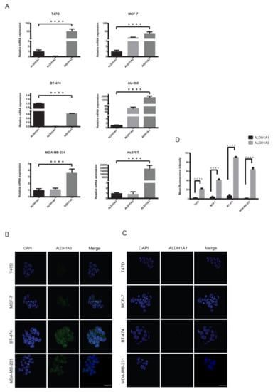 It has been hypothesized that the ALDH1 isoform ALDH1A1 is responsible for the metastatic property in breast cancer cells with high ALDH activity [25,38]. However, its role as a potential CSC remains controversial [12,22]. In our mammosphere experiments, ALDHbr cells did not show high viability and sphere-forming ability. Therefore, to verify this hypothesis, we first compared the expression of ALDH1 isoforms (A1, A2 and A3) in all breast cancer cell lines using qRT-PCR. We found that with the exception of BT-474, ALDH1A1 expression was very low in all cell lines, whereas ALDH1A3 was overexpressed in all lines (p < 0.0001) (Figure 4A). To further verify whether the mRNA expression translates to protein expression, we performed an immunofluorescence analysis of ALDH1A1 and ALDH1A3 in long-term mammospheres of luminal cell lines and compared this with the highly tumorigenic MDA-MB-231 cell line. The results showed high ALDH1A3 expression in all cell lines including BT-474 (p < 0.0001) (Figure 4B–D), which is surprising as it showed a higher expression of ALDH1A1 in qRT-PCR experiments. Finally, to analyze the claim that ALDHbr cells are key tumorigenic cells in HER2-OE breast cancer [14,26], we compared the mRNA expression of the aforementioned key markers genes for pluripotency, proliferation and EMT/metastasis between the CD44−/low/CD24−/low and ALDHbr subpopulations from the HER2-OE cell lines BT-474 and AU-565. The expression of these genes did not differ significantly between the CD44−/low/CD24−/low and ALDHbr subpopulations. Overall, these markers were marginally overexpressed in the CD44−/low/CD24−/low subpopulation, showing that ALDHbr cells may not correlate with EMT, pluripotency or proliferation in HER2-OE cell lines. (Supplementary Figure S3B). Our results support previous studies, which have shown that ALDH1A3 is highly expressed in ALDHbr cells and that ALDH1A1 expression may not be directly related to proliferation and metastasis in breast cancer [23,39].