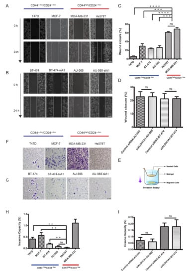 Luminal CD44−/low/CD24−/low cells show low migratory but high invasive properties. Representative images and (A,B) comparison of the wound closure rate (C) of different populations show that CD44high/CD24−/low cells from triple-negative cell lines had a high rate of cell migration. (E) Schematic representation of the transwell invasion assay. The 1 × 104 cells in serum-free medium were seeded in matrigel. Cells migrating to lower chambers filled with complete medium were counted after 24 h under a microscope. (F,G) Representative images of migrated cells. (H) Comparison of invasive capacity showing low invasive properties of CD44high/CD24−/low cells and CD44−/low/CD24−/low cells from the Hs578T and AU-565 cell lines, respectively. (D,I) Comparison of siALDH1A1 with control in HER2-OE cell lines for wound healing and transwell invasion assays. Data represent the mean ± SD (n = 3); ** p < 0.01, *** p < 0.001, and **** p < 0.0001. Scale bar = 200 μm.