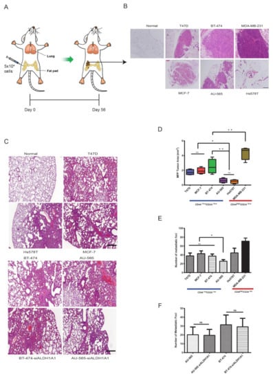 Finally, we compared the tumorigenic and metastatic potential of these populations in xenotransplanted 6-week-old female NSG mice. FACS-isolated 5 × 104 cells were injected in the mammary fat pad (MFP) at the 4th or 5th nipple site orthotopically and, after 56 days (8 weeks), lungs and the MFP were harvested. Locally, at the site of injection, MDA-MB-231 CD44high/CD24−/low xenotransplants formed the largest tumors. However, luminal CD44−/low/CD24−/low xenotransplants formed larger tumors than Hs578T (p < 0.05) (Figure 6B,D). In terms of lung metastasis, CD44−/low/CD24−/low xenotransplants from luminal cell lines formed significantly more metastatic foci (≥200 µm) compared to CD44−/low/CD24−/low xenotransplants from AU-565 (p < 0.05). CD44high/CD24−/low xenotransplants from the triple-negative MDA-MB-231 cell line showed a higher number of metastatic foci compared to CD44−/low/CD24−/low xenotransplants from luminal cell lines, while CD44high/CD24−/low xenotransplants from Hs578T had only a marginally higher number of metastatic foci compared to CD44−/low/CD24−/low xenotransplants from the luminal cell lines T47D and BT-474 (Figure 6C,E). Knockdown of ALDH1A1 did not affect the metastatic efficiency of ALDHbr cells in HER2-OE cell lines (Figure 6C,F).