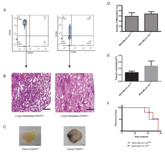 High tumorigenicity in MDA-MB-231 is not CD44 dependent. Analysis of the CD44high/CD24−/low and CD44−/low/CD24−/low populations in MDA-MB-231. Cells from short-term (7-days) and long-term (21 days) mammosphere culture were isolated by FACS (A) and injected in the MFP of female NSG mice as described earlier. (B) Representative images of H&E-stained lung metastasis. (C) Representative images of solid tumors. Scale bar = 0.5 cm. Comparison of lung metastatic foci (D), tumor volume (E), and survival rate (F). Data represent the mean ± SD of three independent experiments. Scale bar = 200 μm.