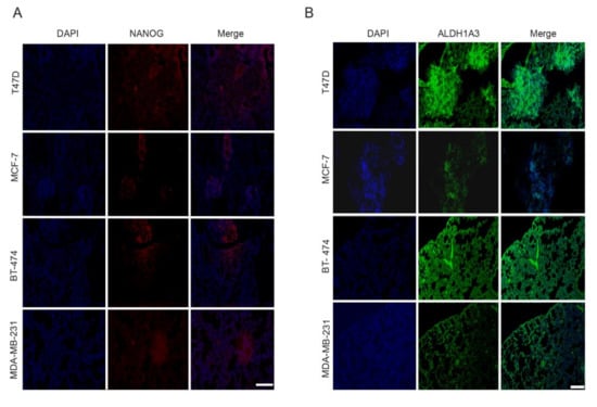 There is increasing evidence that the gene expression profile of CSCs or tumorigenic cells depends on the changes in their microenvironment and thus is dynamic [42,43]. This aspect may complicate the identification of CSC-specific biomarkers. This dynamism would be reflected in the differential gene expression observed from the primary tumor site to the site of metastasis in CSCs. To assess this dynamic, we analyzed the expression of NANOG and ALDH1A3 in lung metastatic sites by immunohistofluorescence. These genes are highly expressed in luminal CD44−/low/CD24−/low and MDA-MB-231 cells, as demonstrated by our qRT-PCR and immunofluorescence analysis. Our analysis shows that both NANOG and ALDH1A3 were consistently expressed at the metastatic site (Figure 8A,B) in all luminal xenotransplants. Mice xenotransplanted with CD44high/CD24−/low cells from the triple-negative MDA-MB-231 cell line showed a similar expression of both NANOG and ALDH1A3. Overall, our results show that the expression of NANOG and ALDH1A3 remains stable during metastasis, probably not affected by change in the tumor microenvironment.