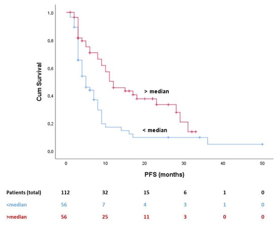 Totally one hundred and twelve NSCLC patients were enrolled in the current study. Patients’ characteristics are summarized in Table 1. All patients were treated with anti-PD-1 monotherapy (nivolumab or pembrolizumab), in the context of the advanced disease. The majority of the participants were male (76.8%), while 23.2% of them were females. The median age was 67 years (range 39–84 years) with the vast majority of them (86.7%) being current or former smokers. Most of the recruited patients had a confirmed histological diagnosis of adenocarcinoma or squamous cell carcinoma; 14 patients with NSCLC were impossible to be further categorized. Only three of the patients had mutation of the EGFR and none of them bore ALK translocations, while 27 patients had PD-L1 expression over 1%. Nivolumab was exclusively used in 94 patients beyond first line, while pembrolizumab was administered in 13 patients as front-line treatment and in five patients in second line and beyond. All patients had advanced disease with stages 3B, 3C, or stage 4 disease, while two patients with stage 3A disease were also enrolled, as they had inoperable disease.
