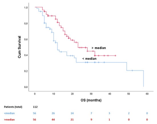 At univariate analysis, PIOS was also associated with post-immunotherapy overall survival (OS) with patients with higher PIOS score (over median) having improved OS (log-rank p = 0.019). Median OS was 32 months for the favorable subgroup and 14 months for the poor responders (Table 3, HR = 0.539, 95% CI 0.317–0.918). Potential covariates, sex (p = 0.049), histological subtype (p = 0.017), PS (p < 0.001), and LOT (p = 0.051) were counted for the multivariate analysis. After adjustment, PIOS score remained statistically significant (Table 2, p = 0.030, HR = 0.001, 95% CI 0.000–0.571) (Figure 2).