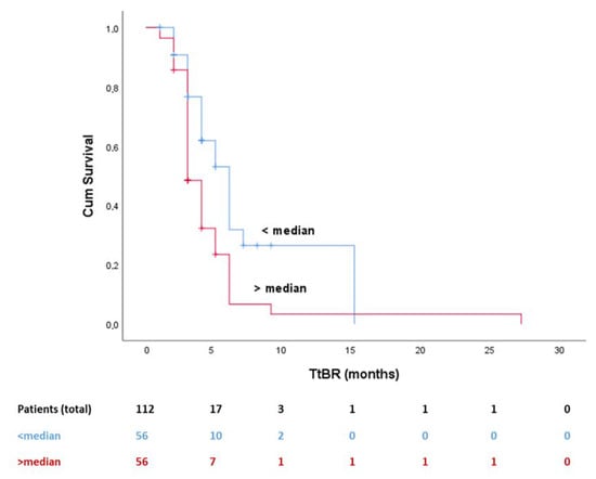 In addition, based on time to event (BOR) analysis, PIOS was associated with time to best response (TtBR), since patients with higher (>median) scores achieved faster BOR compared to patients with lower scores (Figure 3, p = 0.001). Additionally, patients with higher PIOS score (>median) had longer time in best response (TiBR) (p = 0.017) and total time in best response (TTBR) (p = 0.028), experiencing, therefore, a longer survival benefit, compared to the ones with low PIOS score.