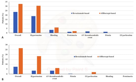 The toxicity profile for the overall study population and according to subgroups is summarized in Table 5. The incidence of G1/G2 VEGF inhibitors class-specific AEs was 23.7% and 32.7% in the Bevacizumab-treated group and in the Aflibercept-treated group, respectively (p = 0.1908). The incidence of G3/G4 VEGF inhibitors class-specific AEs was 7.5% and 26.5% in the Bevacizumab-treated group and in the Aflibercept-treated group, respectively (p = 0.0001) (Figure 2). The incidence of G1/G2 non hematologic AEs was 36.4% and 59.2% in the Bevacizumab-treated group and in the Aflibercept-treated group, respectively (p = 0.0033), while the incidence of G3/G4 non hematologic AEs was 4.4% and 10.2%, respectively (p = 0.1032). The incidence of G1/G2 hematologic AEs was 24.6% and 22.4% in the Bevacizumab-treated group and in the Aflibercept-treated group, respectively (p = 0.7545), while the incidence of G3/G4 hematologic AEs was 3.1% and 18.4%, respectively (p < 0.0001).