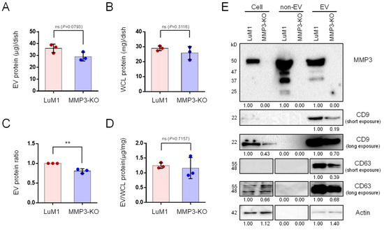 2.1. MMP3 Knockout Reduces the Release of CD9 and CD63 within Extracellular Vesicles