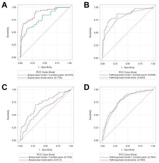 Using findings from Table 2, receiver-operating characteristic (ROC) curve analyses were examined for the primary study endpoints of disease progression, using only the proteins that achieved statistical significance for each study endpoint, including 4 protein markers for DM and 3 markers for BCR (Figure 1A–D). Serum PSA alone was also added to each figure for comparison. These marker panels were then combined with two sets of SOC variables—one consisting of clinical variables determined at prostate diagnostic biopsy (“biopsy base model”) including age, race, and National Comprehensive Cancer Network (NCCN)-risk strata and the second set consisting of pathology variables measured at time of RP (“pathology base model”) including pathological T stage, GG, and surgical margin status. The curves were examined for base models alone and base models plus the protein marker panels to determine whether improvement in AUC values was noted when protein panels were modeled concomitantly with base models. In Figure 1A,B, distant metastasis was examined as a function of protein panel including FOLH1, SPARC, TGFB1, and PSA; when added to the biopsy base model, the AUC increased to 0.88 from 0.77 (Figure 1A), while in the pathology base model, the AUC increased to 0.86 from 0.80 (Figure 1B). In Figure 1C,D, BCR was similarly examined as a function of a protein panel including FOLH1, SPARC, and TGFB1; when added to the biopsy base model, the AUC increased to 0.72 from 0.61 (Figure 1C), while in the pathology base model, the AUC increased to 0.79 from 0.77 (Figure 1D).