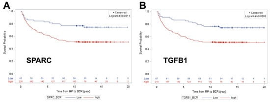Kaplan–Meier BCR-free survival curves across high versus low groups for SPARC (A) and TGFB1 (B).