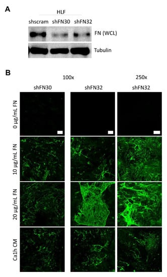 Next, we explored the relationship between soluble FN produced by tumor cells and fibroblast matrix deposition. To this end, we depleted FN production in HLF cells through lentiviral-mediated transduction using two distinct shRNAs (shFN30 and shFN32). Depletion of intracellular levels of FN was verified by immunoblotting of whole cell lysates (Figure 4A and Figure S8). Immunostaining of decellularized slides indicated that no FN matrix was produced when the FN-depleted cells were cultured in standard serum-free media (Figure 4B). However, when soluble FN was added (10 µg/mL and 20 µg/mL), a fibrillar FN matrix was established that was indistinguishable from the matrix produced by wild-type HLF cells (Figure 4B and Figure 2B). In addition, when FN-depleted HLF cells were cultured in serum-free media conditioned by Ca1h cells for 72 h, a FN matrix was also established (Figure 4B).